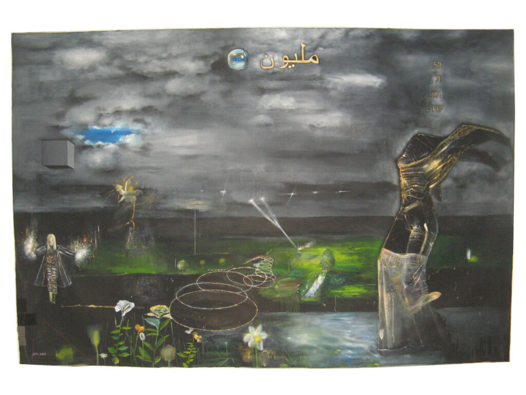 Oil, embroidery on canvas